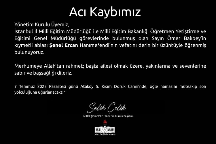 7 Temmuz 2025 Pazartesi günü Ataköy 5. Kısım Doruk Camii’nde, öğle namazını müteakip son yolculuğuna uğurlanacaktır.