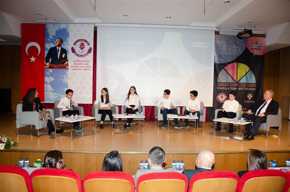 Konferans programının son bölümünde ise MEV Koleji Özel Ankara Okulları öğrencilerinden oluşan 6 kişilik bir öğrenci grubu Ralph Tabberer ve Kathryn Joy moderatörlüğünde Cambridge Eğitim sistemi ve 21. Yüzyıl becerileri konulu bir panel gerçekleştirdi. Moderatörlerden ve farklı okullardan gelen öğretmenlerin gelen soruları büyük bir özgüven ile yanıtlayan öğrencilerimiz, sistemin kendileri kattıkları konusunda da fikirlerini sundular ve gelecek için planlarından bahsettiler.
